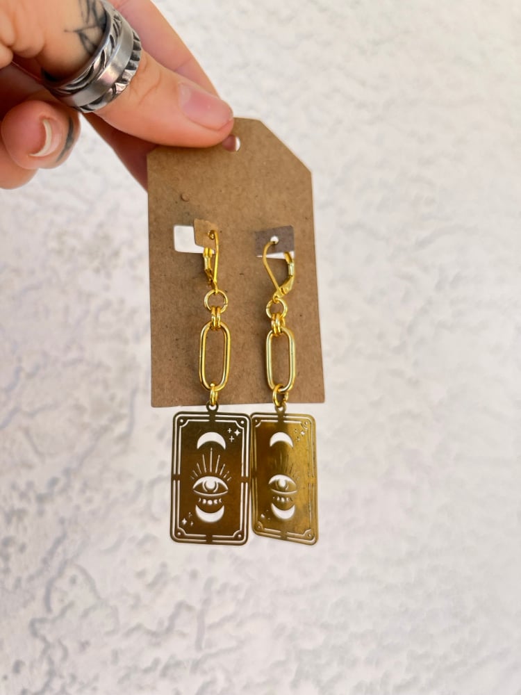 Gold base: Tarot card brass charms. Gold plated findings. Gold plated lever back clasps.